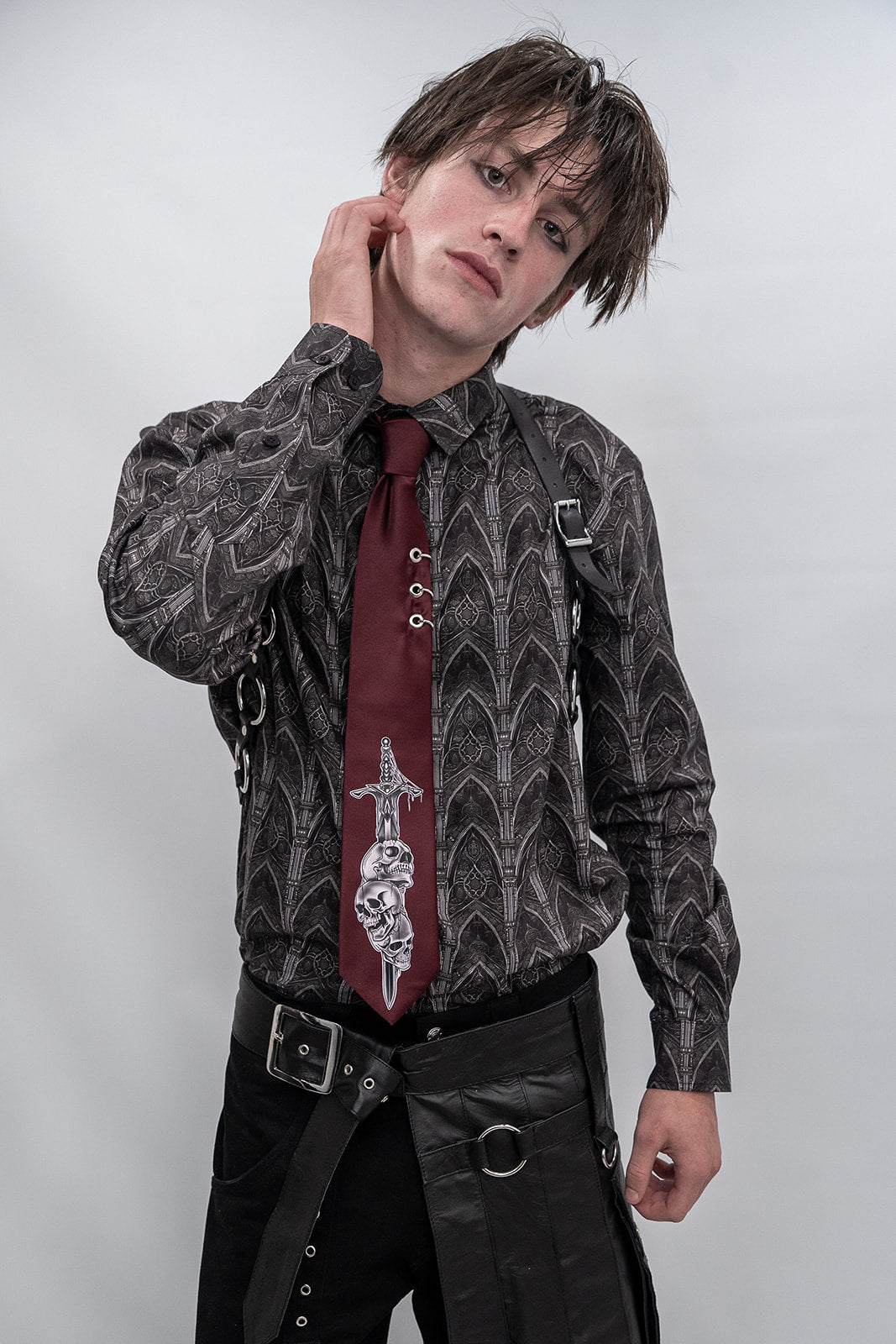 Dress to impress in this dress shirt inspired by gothic architecture made from 100% cotton. Long sleeve button up shirt, tie and harness not included.