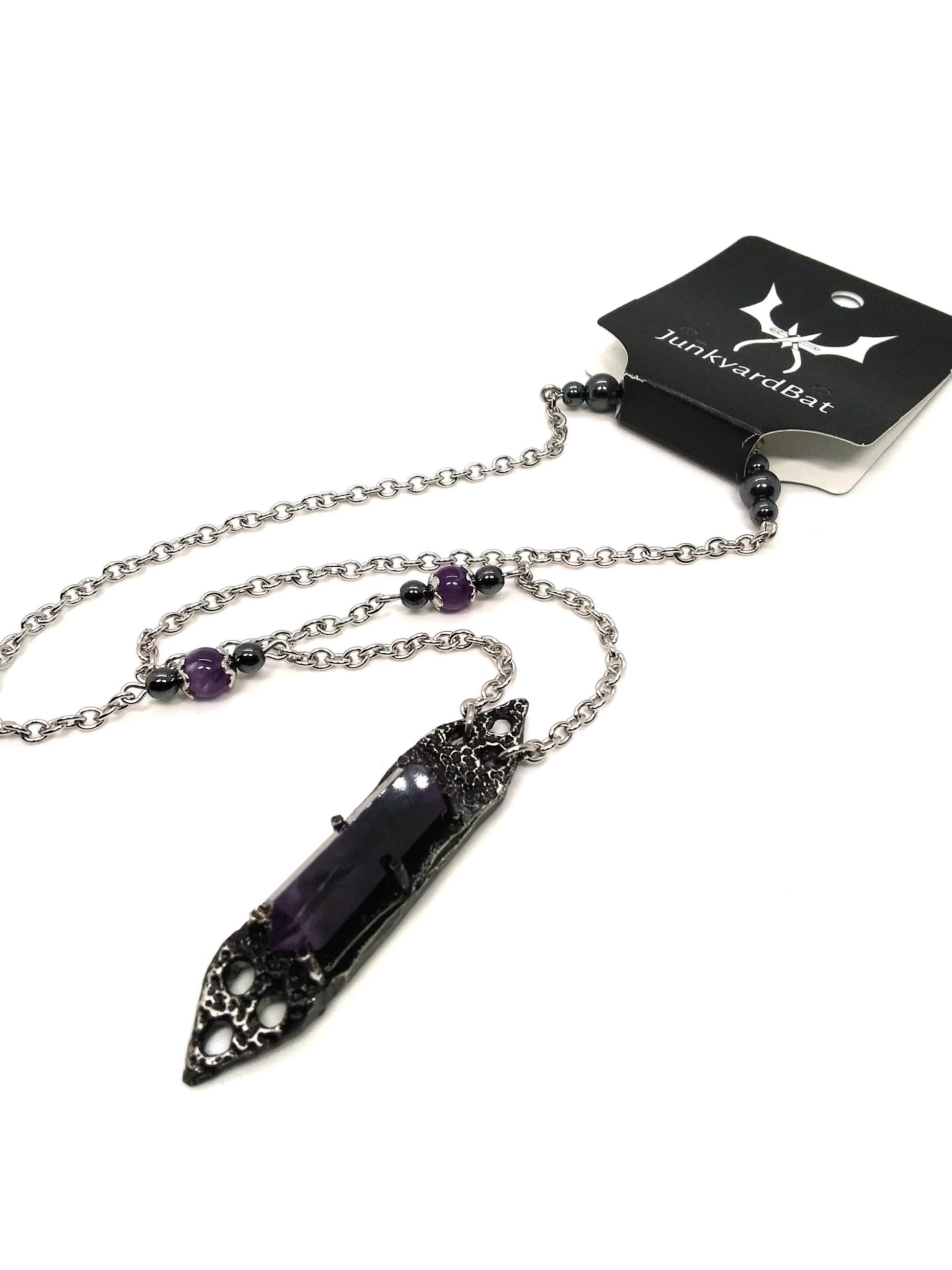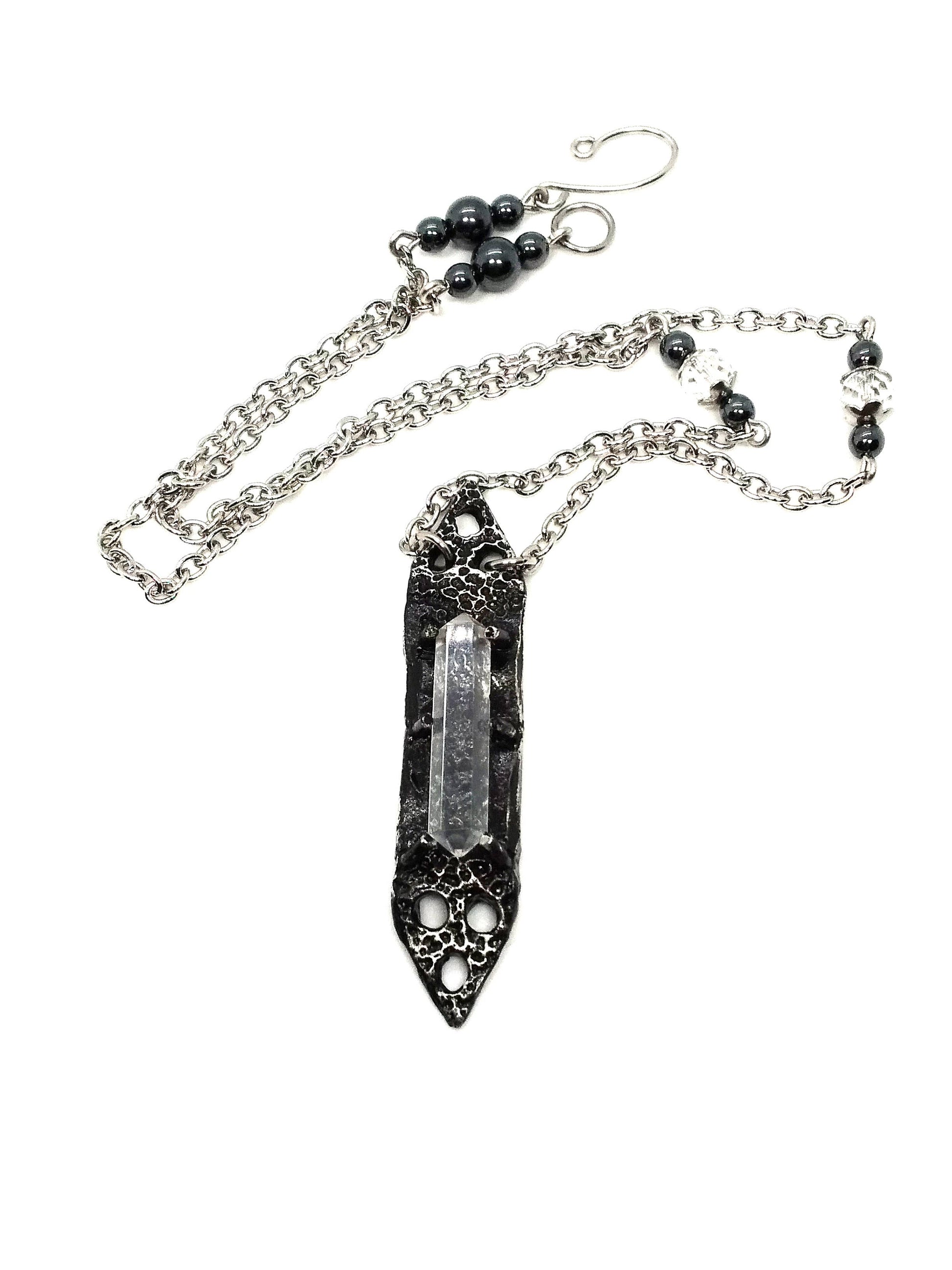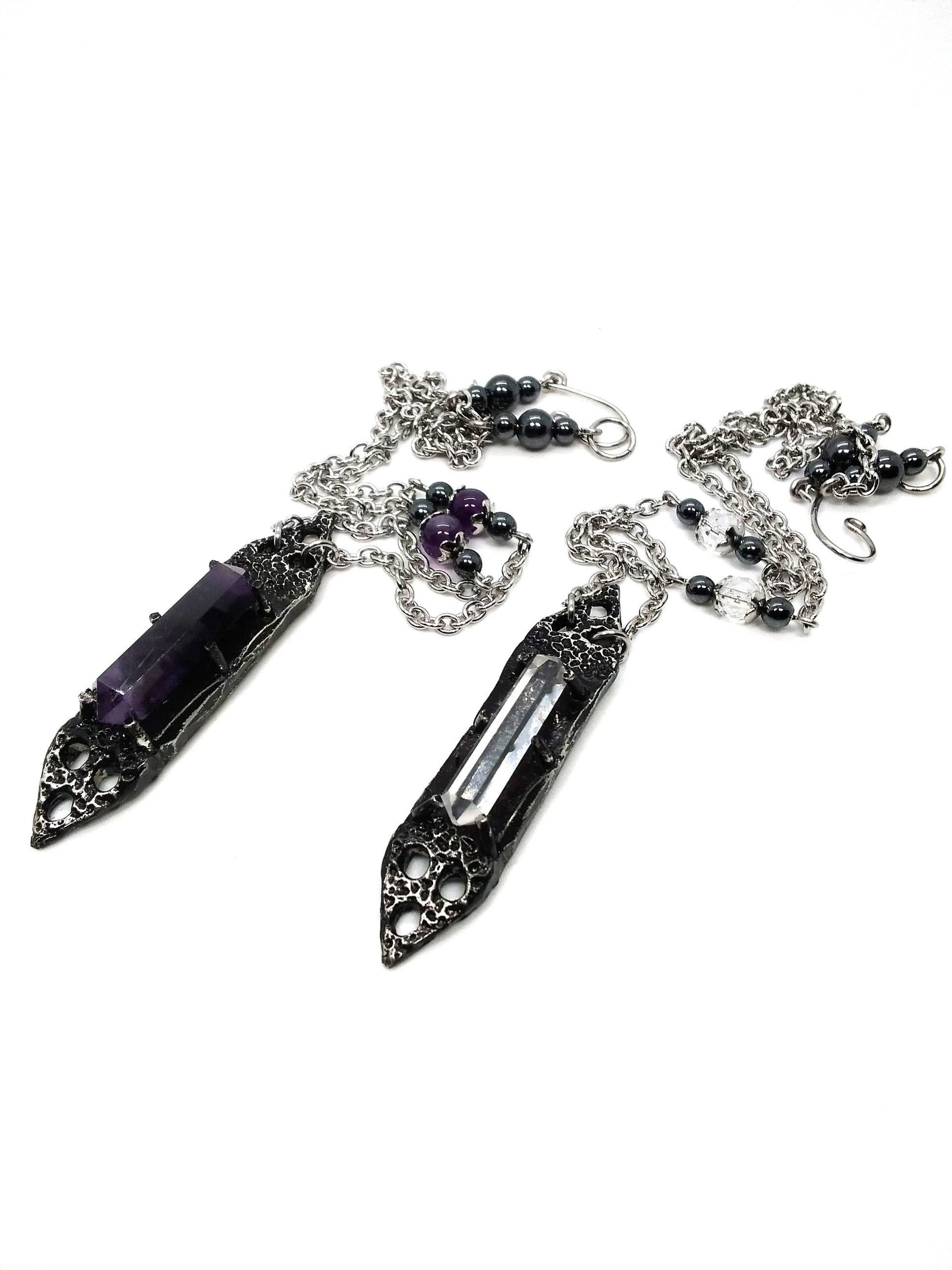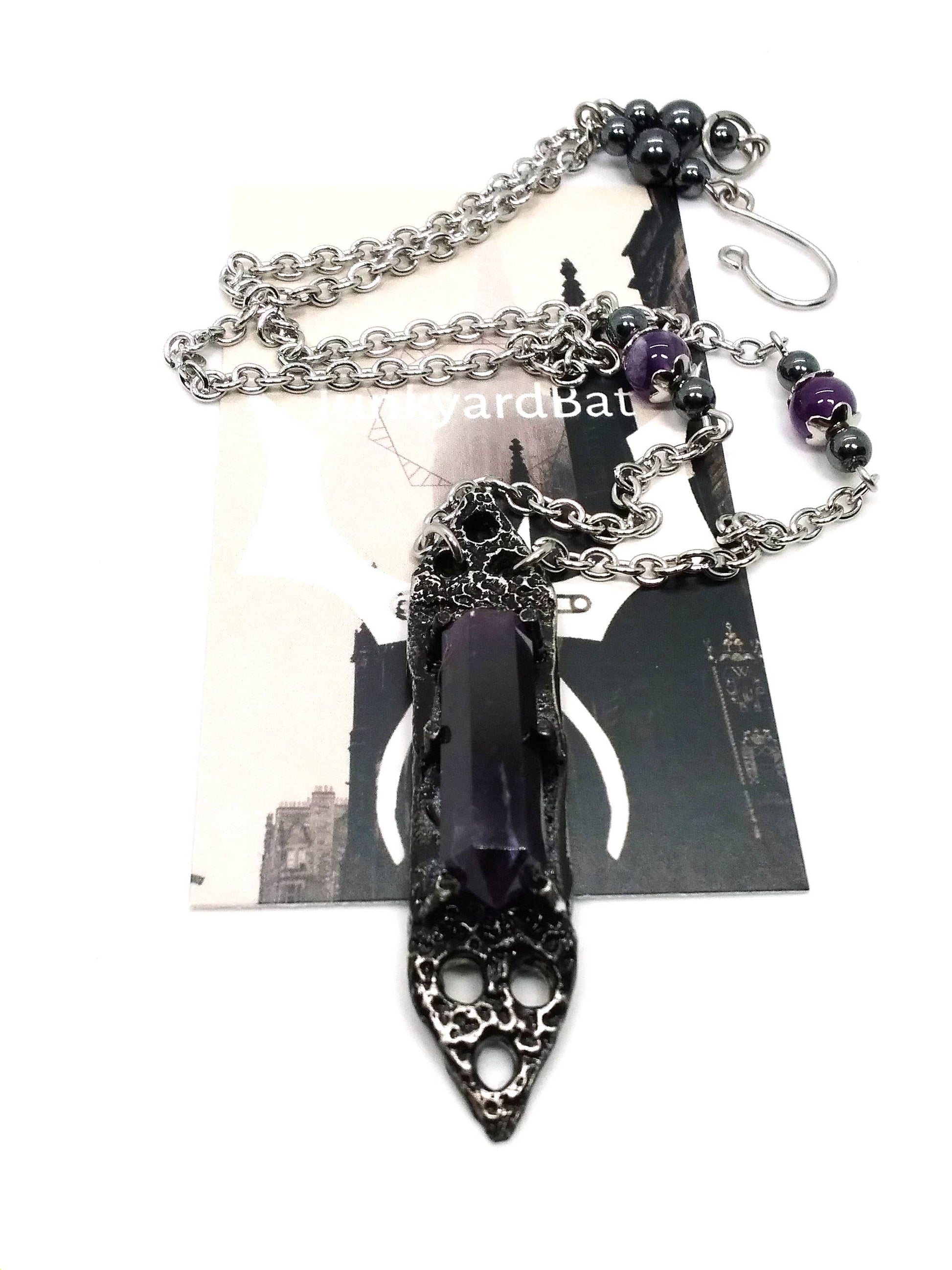 Evoking the desolation of a ruined cathedral, this necklace adds an air of mystery and things long forgotten with its unique design, sculpted in our studio. Perfect for crystal lovers, the pendant clasps a double terminated crystal point to add a spark of natural beauty within the ruins. The pendant is cast in lead free pewter by hand and weathered, then set with a crystal point in amethyst or clear quartz. The chain is accented with hand beaded elements for a finishing touch. It can be layered with one of my rosary chains, or shorter pieces like chokers! Available in multiple variants Necklace chain default length: 18 in