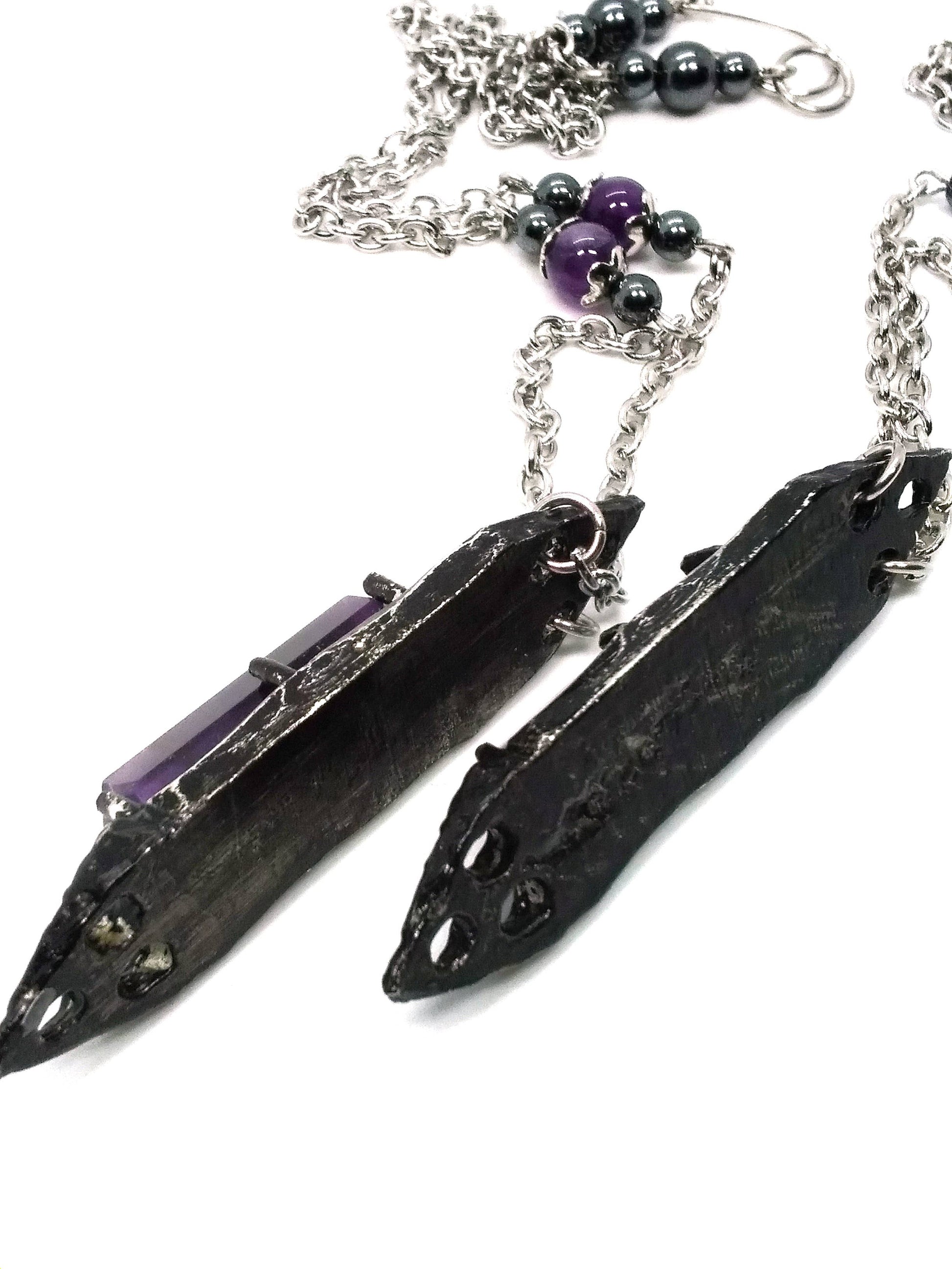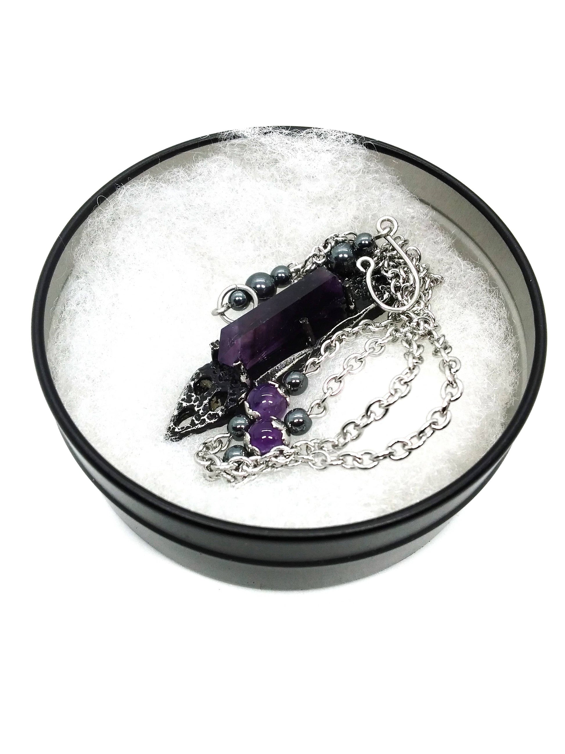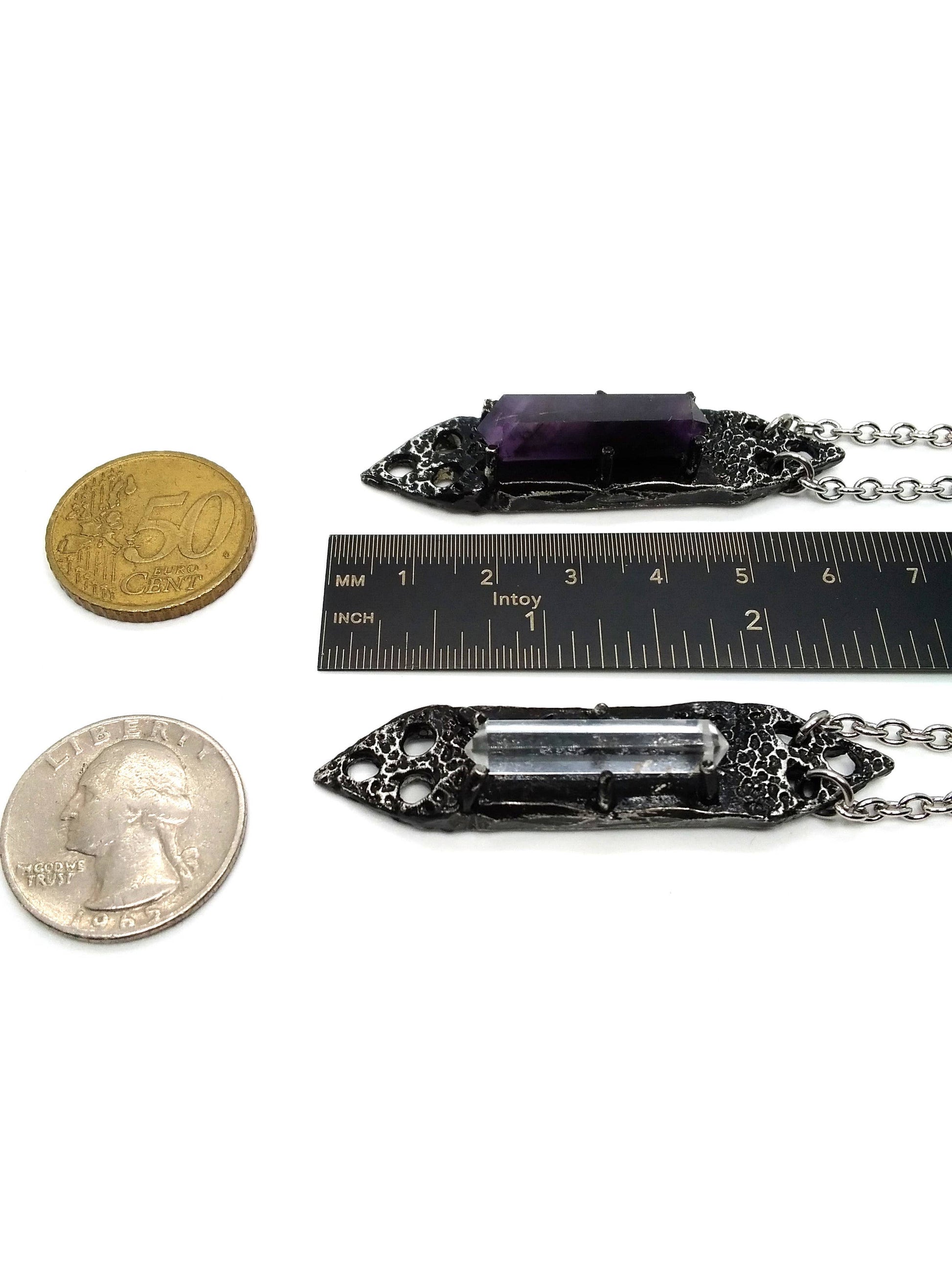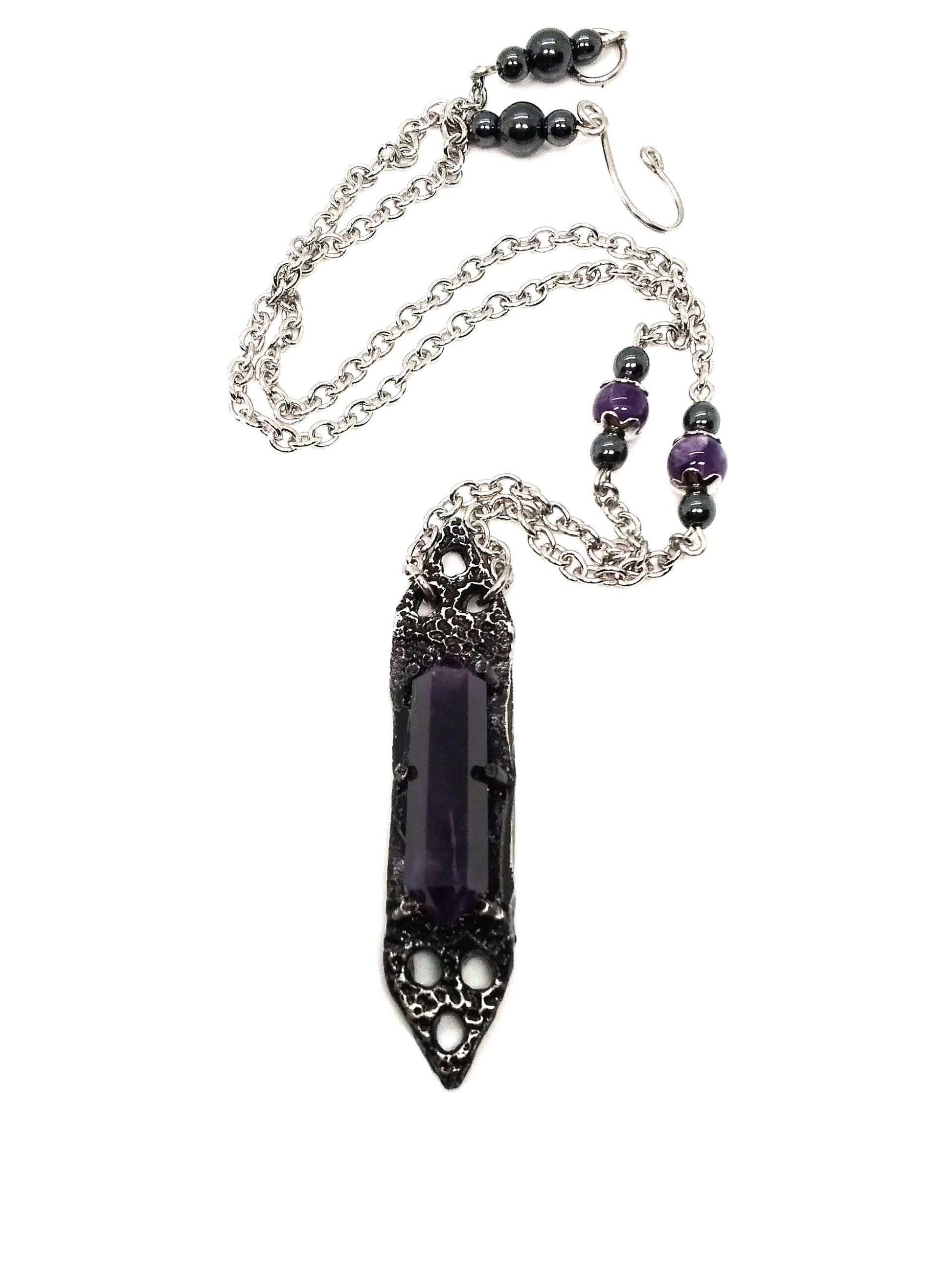 Evoking the desolation of a ruined cathedral, this necklace adds an air of mystery and things long forgotten with its unique design, sculpted in our studio. Perfect for crystal lovers, the pendant clasps a double terminated crystal point to add a spark of natural beauty within the ruins. The pendant is cast in lead free pewter by hand and weathered, then set with a crystal point in amethyst or clear quartz. The chain is accented with hand beaded elements for a finishing touch. It can be layered with one of my rosary chains, or shorter pieces like chokers! Available in multiple variants Necklace chain default length: 18 in