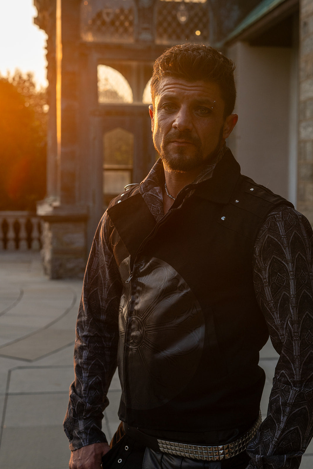 The Confession Moto Vest features an edgy asymmetrical moto style design, crafted from 100% cotton twill for comfort and durability. Its inner pocket adds practicality while the striking rose window graphic on the front adds a touch of Gothic aesthetic. The mock lace up on the back and chain shoulder detailing add an extra touch of attitude. With its easy zipper front closure and true to size fit, it's perfect for all occasions. Inspired by Gothic architecture, this vest is a must-have for any fashion-forward individual.