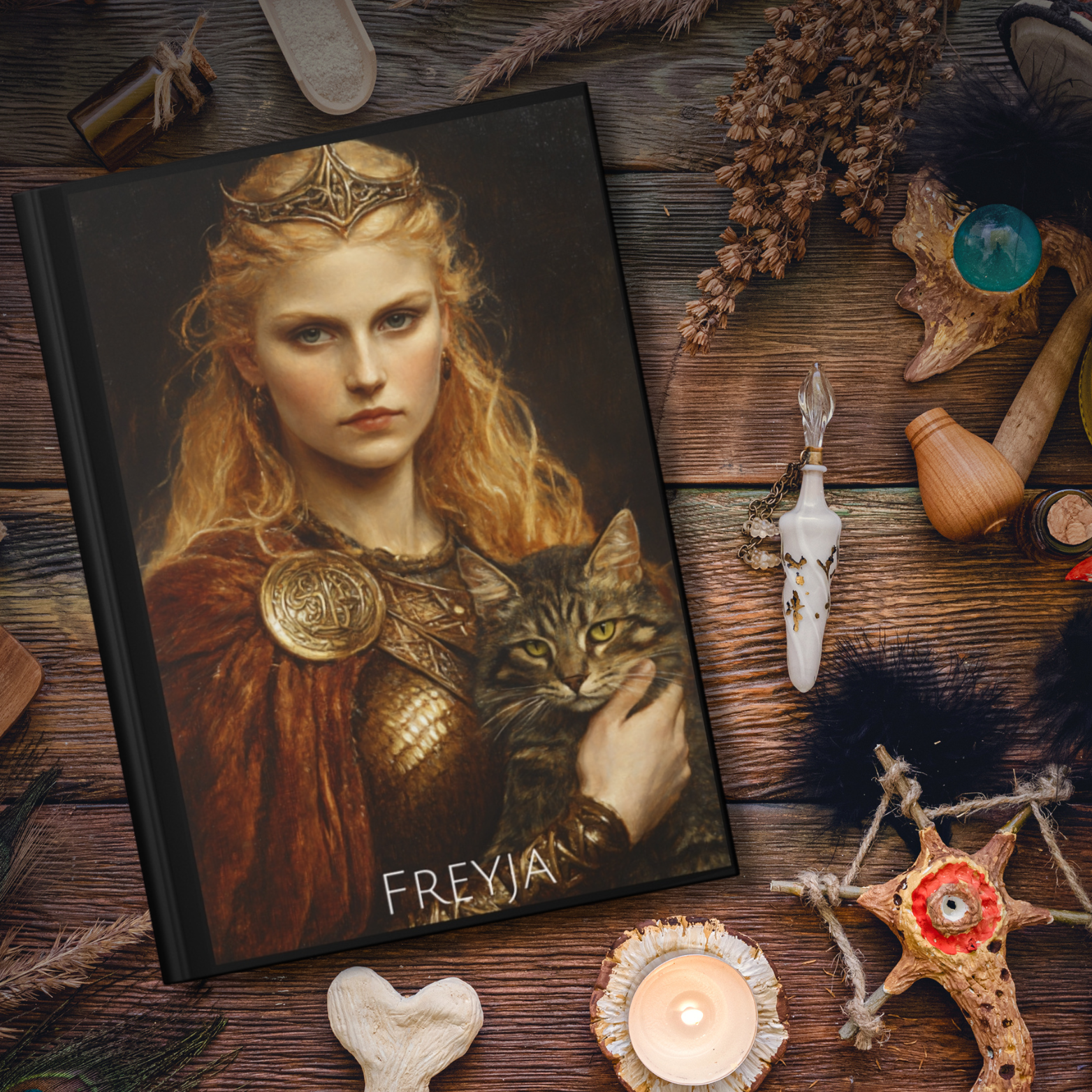 Embrace the divine inspiration of ancient goddesses with our hardbound journals, each featuring a portrait of a revered goddess on the cover and a detailed description of her mythology and attributes on the back. Perfect for spiritual reflection, magical journaling, or as a thoughtful gift for those who honor the sacred feminine. Explore the rich legends and timeless wisdom of these powerful deities as you embark on your own journey of self-discovery and empowerment. Channel the bold beauty and fierce power of Freyja, the Norse Goddess of Love, Fertility, and War, with this captivating journal. Freyja is a symbol of passion, magic, and independence, known for her leadership among the Valkyries and her connection to the realms of life and death.