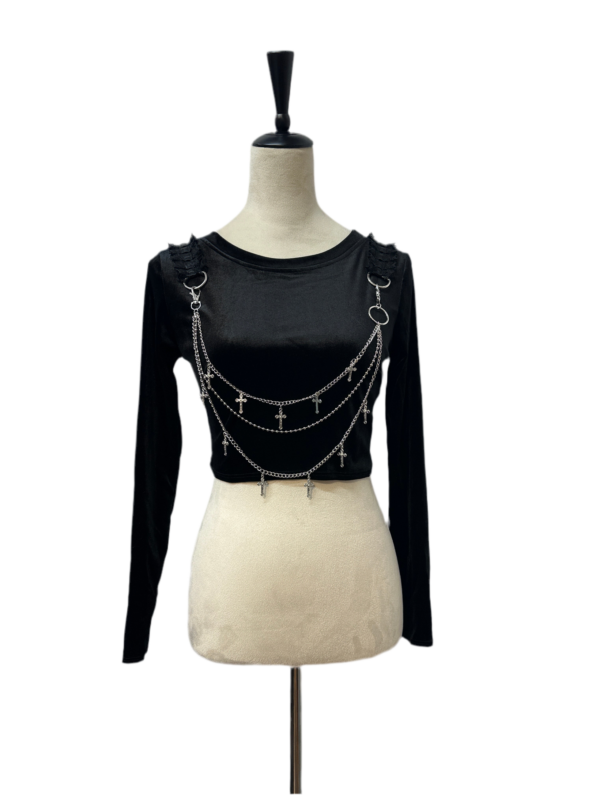 The Holy Cross Velvet Crop adds a holy grail touch to any outfit with its removable chain for endless styling options. This crop top features long sleeves and stretchy velvet material for ultimate comfort. Unleash your inner divinity with this statement piece.