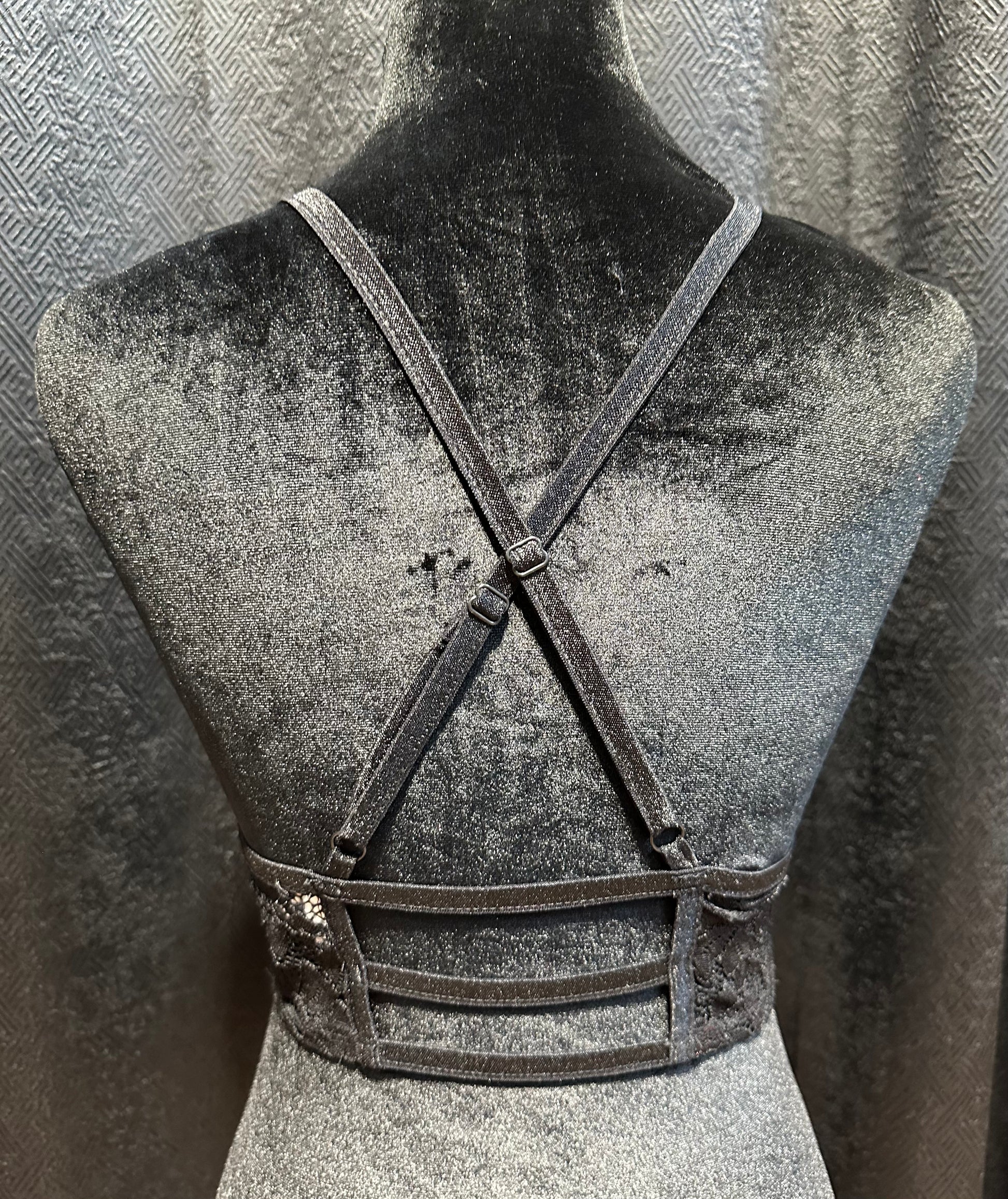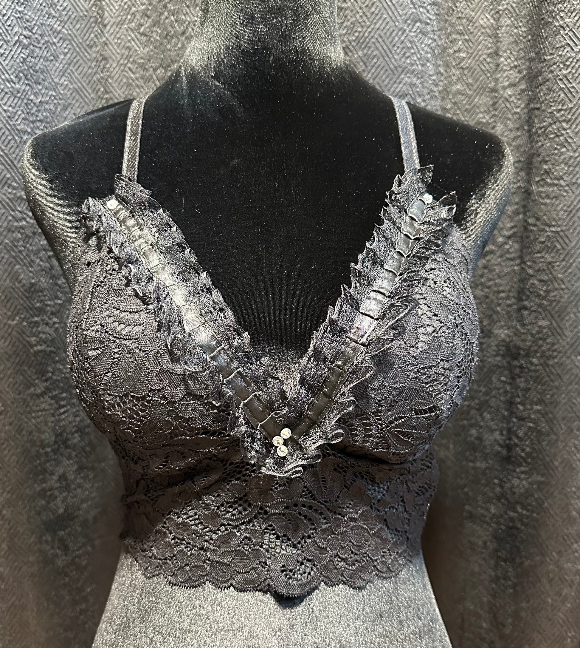This black lace bralette is perfect for club or festival wear, kinky in the bedroom, or paired under a classy outfit. Adorned with clear rhinestones you will feel like the dark princess you are!