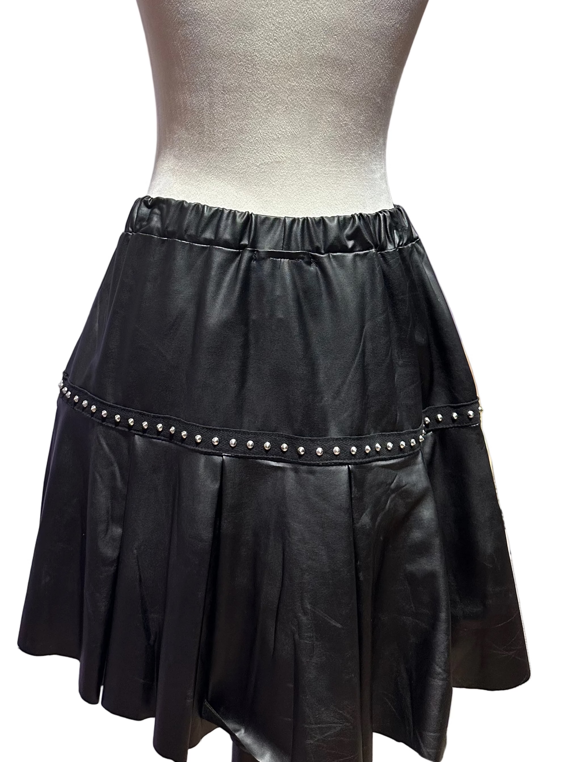 Step into the spotlight with this Pleated Pleather Skirt! Made from vegan leather (no animals were harmed, just some fashion dreams), it features an elastic waist for maximum comfort (it'll stretch with your wild dance moves!). The rivet trim adds a dash of edge to your twirl-tastic style—who said pleats can't party? Get ready to strut your stuff!