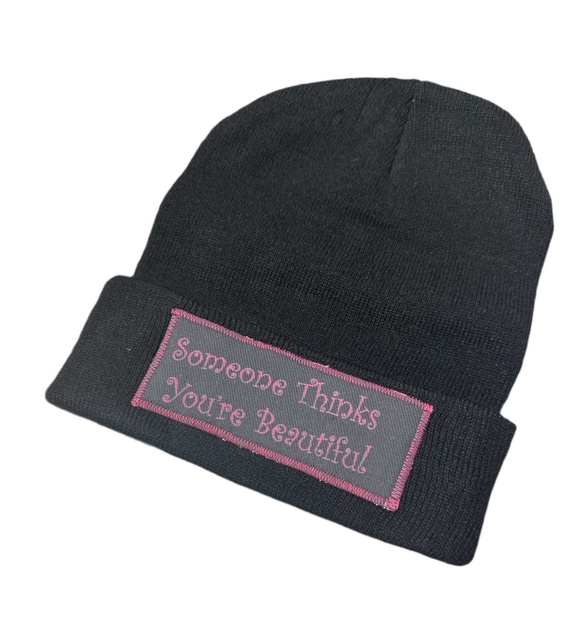 "Unleash your inner confidence with this Someone Thinks You're Beautiful black beanie. With its subtle pink stitching, you'll be sure to catch someone's eye. Complete with cuddles and kisses from a secret admirer, it's the perfect accessory for a playful and flirty look. Own it, you gorgeous thing!"