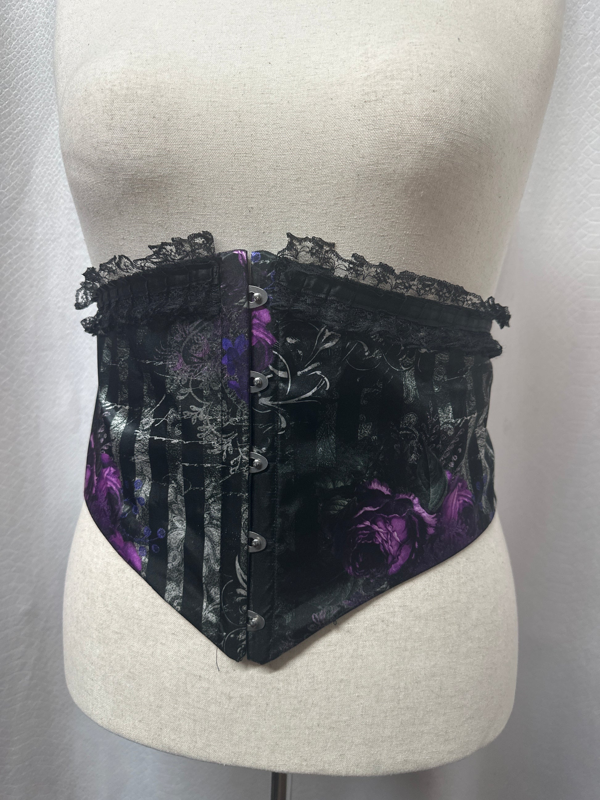 Transform your outfit with our Steampunk Rose Corset Belt! This quirky accessory features light boning, a front busk, and a back lace-up for the perfect fit. The decorative lace trim adds a touch of elegance, while the striped fabric with violet roses adds a fun and unique twist. Upgrade your style with this must-have belt!