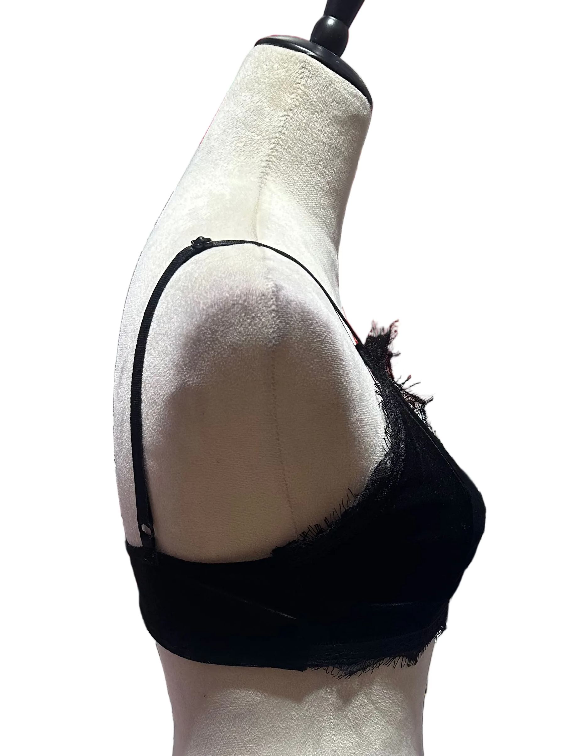Handcrafted velvet bralette in deep black, adorned with shimmering crystal & red jewels for an edgy-luxe moment. Delicate lace detailing pairs with adjustable straps and a secure hook-and-eye closure for a custom fit that feels as good as it looks. Perfect for layering under/over sheer tops or making a bold statement on its own.