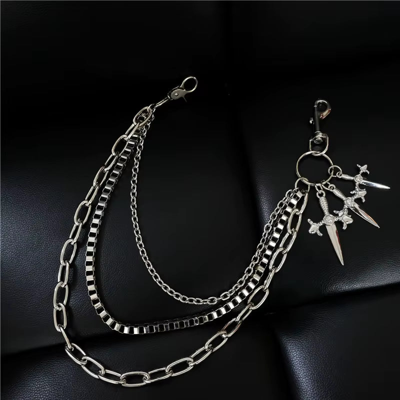 Wallet Chains crafted from heavy-duty metal provide robust strength and durability. Designed with secure clips for easy attachment, these chains offer practical functionality paired with bold aesthetics. Available in two distinctive finishes—sleek silver swords or edgy black spikes—each style adds a unique statement to your accessory collection while ensuring reliable performance. Ideal for anyone seeking both style and utility in their everyday carry.